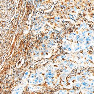 IHC检测Annexin-6/ANXA6蛋白(货号 GB151264). 样品: 人子宫内膜癌, 4%多聚甲醛 (货号G1101) 固定12-24小时. 抗原修复: 柠檬酸抗原修复液(干粉, pH 6.0) (G1201), 高压锅均匀喷气计时2分钟. —抗: 1: 1000稀释, 4℃ 孵育过夜. 二抗: S-vision免疫组化多聚二抗(山羊抗小鼠), 即用型(货号G1301), 室温孵育20分钟. |