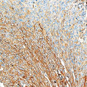 IHC检测Annexin-6/ANXA6蛋白(货号 GB151264). 样品: 人食管癌, 4%多聚甲醛 (货号G1101) 固定12-24小时. 抗原修复: 柠檬酸抗原修复液(干粉, pH 6.0) (G1201), 高压锅均匀喷气计时2分钟. —抗: 1: 1000稀释, 4℃ 孵育过夜. 二抗: S-vision免疫组化多聚二抗(山羊抗小鼠), 即用型(货号G1301), 室温孵育20分钟. |