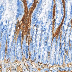 IHC检测Annexin-6/ANXA6蛋白(货号 GB151264). 样品: 小鼠小肠, 4%多聚甲醛 (货号G1101) 固定12-24小时. 抗原修复: 柠檬酸抗原修复液(干粉, pH 6.0) (G1201), 高压锅均匀喷气计时2分钟. —抗: 1: 1000稀释, 4℃ 孵育过夜. 二抗: S-vision免疫组化多聚二抗(山羊抗小鼠), 即用型(货号G1301), 室温孵育20分钟. |