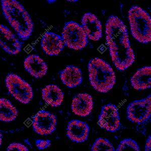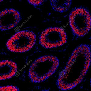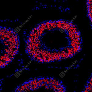 | IF检测DDX4蛋白(货号 GB150101)(红色). 样品: 小鼠睾丸, 4%多聚甲醛 (货号G1101) 固定12-24小时. 抗原修复: Tris-EDTA抗原修复液(pH 9.0) (G1203), 100℃, 25分钟. 封闭: 3% BSA(货号GC305010)的PBS溶液, 室温孵育30分钟. —抗: 1: 1000稀释, 4℃ 孵育过夜. 二抗: Cy3标记山羊抗兔IgG (H+L) (货号GB21303), 1: 300稀释, 室温孵育1小时. |