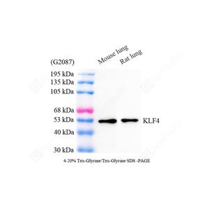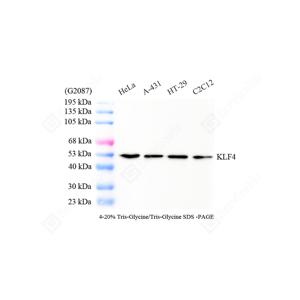 | WB检测KLF4蛋白(货号 GB150105). 样品: 经RIPA裂解液(货号G2002)处理的蛋白质. 封闭: 3%脱脂牛奶(货号GC310001)溶于TBST溶液, 室温孵育1小时. —抗: 1: 1000稀释, 4℃ 孵育过夜. 二抗: HRP标记山羊抗兔IgG (H+L) (货号GB23303), 1: 5000稀释, 室温孵育1小时. |