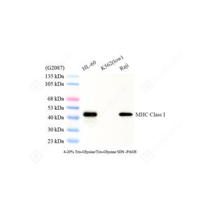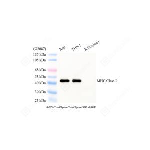 | WB检测MHC Class I蛋白(货号 GB150092). 样品: 经RIPA裂解液(货号G2002)处理的蛋白质. 封闭: 3%脱脂牛奶(货号GC310001)溶于TBST溶液, 室温孵育1小时. —抗: 1: 1000稀释, 4℃ 孵育过夜. 二抗: HRP标记山羊抗兔IgG (H+L) (货号GB23303), 1: 5000稀释, 室温孵育1小时. |