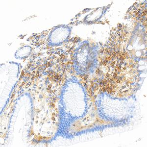 | IHC检测MHC Class I蛋白(货号 GB150092). 样品: 人结肠, 4%多聚甲醛 (货号G1101) 固定12-24小时. 抗原修复: Tris-EDTA抗原修复液(pH 9.0) (G1203), 100℃, 25分钟. —抗: 1: 1000稀释, 4℃ 孵育过夜. 二抗: S-vision免疫组化多聚二抗(山羊抗兔),即用型 (货号G1302), 室温孵育20分钟. |