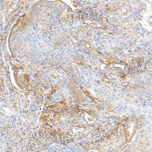 | IHC检测MHC Class I蛋白(货号 GB150092). 样品: 人肺癌, 4%多聚甲醛 (货号G1101) 固定12-24小时. 抗原修复: Tris-EDTA抗原修复液(pH 9.0) (G1203), 100℃, 25分钟. —抗: 1: 1000稀释, 4℃ 孵育过夜. 二抗: S-vision免疫组化多聚二抗(山羊抗兔),即用型 (货号G1302), 室温孵育20分钟. |