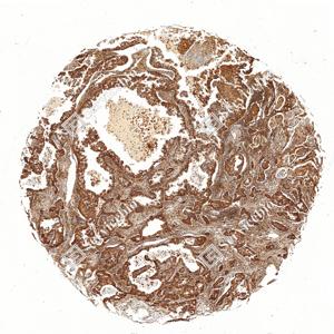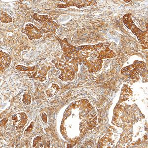 | IHC检测MHC Class I蛋白(货号 GB150092). 样品: 人肺腺癌, 4%多聚甲醛 (货号G1101) 固定12-24小时. 抗原修复: Tris-EDTA抗原修复液(pH 9.0) (G1203), 100℃, 25分钟. —抗: 1: 1000稀释, 4℃ 孵育过夜. 二抗: S-vision免疫组化多聚二抗(山羊抗兔),即用型 (货号G1302), 室温孵育20分钟. |