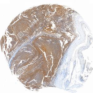 | IHC检测MHC Class I蛋白(货号 GB150092). 样品: 人肺癌, 4%多聚甲醛 (货号G1101) 固定12-24小时. 抗原修复: Tris-EDTA抗原修复液(pH 9.0) (G1203), 100℃, 25分钟. —抗: 1: 3000稀释, 4℃ 孵育过夜. 二抗: S-vision免疫组化多聚二抗(山羊抗兔),即用型 (货号G1302), 室温孵育20分钟. |