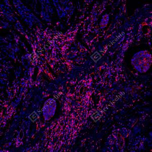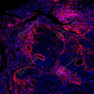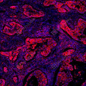 | IF检测MHC Class I蛋白(货号 GB150092)(红色). 样品: 人肺癌, 4%多聚甲醛 (货号G1101) 固定12-24小时. 抗原修复: Tris-EDTA抗原修复液(pH 9.0) (G1203), 100℃, 25分钟. 封闭: 3% BSA(货号GC305010)的PBS溶液, 室温孵育30分钟. —抗: 1: 1000稀释, 4℃ 孵育过夜. 二抗: Cy3标记山羊抗兔IgG (H+L) (货号GB21303), 1: 300稀释, 室温孵育1小时. |