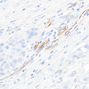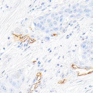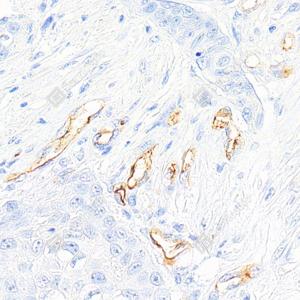 IHC检测PODXL蛋白(货号 GB150020). 样品: 人食管癌, 4%多聚甲醛 (货号G1101) 固定12-24小时. 抗原修复: 柠檬酸抗原修复液(干粉, pH 6.0) (G1201), 高压锅均匀喷气计时2分钟. —抗: 1: 500稀释, 4℃ 孵育过夜. 二抗: S-vision免疫组化多聚二抗(山羊抗兔),即用型 (货号G1302), 室温孵育20分钟. |