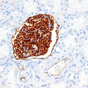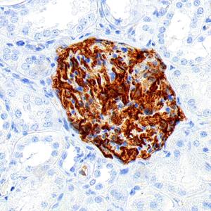 IHC检测PODXL蛋白(货号 GB150020). 样品: 人肾, 4%多聚甲醛 (货号G1101) 固定12-24小时. 抗原修复: 柠檬酸抗原修复液(干粉, pH 6.0) (G1201), 高压锅均匀喷气计时2分钟. —抗: 1: 1000稀释, 4℃ 孵育过夜. 二抗: S-vision免疫组化多聚二抗(山羊抗兔),即用型 (货号G1302), 室温孵育20分钟. |