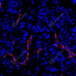 IF检测PODXL蛋白(货号 GB150020)(红色). 样品: 人食管癌, 4%多聚甲醛 (货号G1101) 固定12-24小时. 抗原修复: Tris-EDTA抗原修复液(pH 9.0) (G1203), 98℃, 20分钟. 封闭: 3% BSA(货号GC305010)的PBS溶液, 室温孵育30分钟. —抗: 1: 1000稀释, 4℃ 孵育过夜. 二抗: Cy3标记山羊抗兔IgG (H+L) (货号GB21303), 1: 300稀释, 室温孵育1小时. |