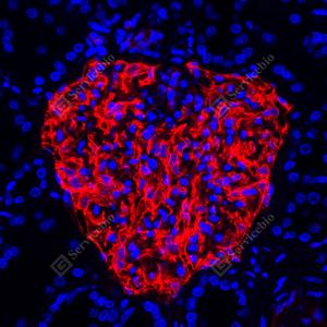 IF检测PODXL蛋白(货号 GB150020)(红色). 样品: 人肾, 4%多聚甲醛 (货号G1101) 固定12-24小时. 抗原修复: Tris-EDTA抗原修复液(pH 9.0) (G1203), 98℃, 20分钟. 封闭: 3% BSA(货号GC305010)的PBS溶液, 室温孵育30分钟. —抗: 1: 1000稀释, 4℃ 孵育过夜. 二抗: Cy3标记山羊抗兔IgG (H+L) (货号GB21303), 1: 300稀释, 室温孵育1小时. |