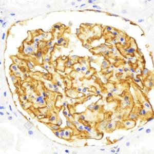 IHC检测PODXL蛋白(货号 GB152052). 样品: 人肾, 4%多聚甲醛 (货号G1101) 固定12-24小时. 抗原修复: 柠檬酸抗原修复液(干粉, pH 6.0) (G1201), 高压锅均匀喷气计时2分钟. —抗: 1: 1000稀释, 4℃ 孵育过夜. 二抗: HRP标记山羊抗小鼠IgG (H+L) (货号GB23301), 1: 200稀释, 室温孵育1小时. |
