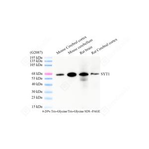 | WB检测SYT1蛋白(货号 GB152106). 样品: 经RIPA裂解液(货号G2002)处理的蛋白质. 封闭: 3%脱脂牛奶(货号GC310001)溶于TBST溶液, 室温孵育1小时. —抗: 1: 1000稀释, 4℃ 孵育过夜. 二抗: HRP标记山羊抗兔IgG (H+L) (货号GB23303), 1: 5000稀释, 室温孵育1小时. |