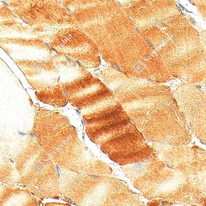 | IHC检测alpha Actinin 2蛋白(货号 GB15230). 样品: 人骨骼肌, 4%多聚甲醛 (货号G1101) 固定12-24小时. 抗原修复: Tris-EDTA抗原修复液(pH 9.0) (G1203), 98℃, 20分钟. —抗: 1: 50稀释, 4℃ 孵育过夜. 二抗: S-vision免疫组化多聚二抗(山羊抗小鼠), 即用型(货号G1301), 室温孵育20分钟. |