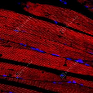 | IF检测alpha Actinin 2蛋白(货号 GB15230)(红色). 样品: 小鼠骨骼肌, 4%多聚甲醛 (货号G1101) 固定12-24小时. 抗原修复: Tris-EDTA抗原修复液(pH 9.0) (G1203), 98℃, 20分钟. 封闭: 3% BSA(货号GC305010)的PBS溶液, 室温孵育30分钟. —抗: 1: 50稀释, 4℃ 孵育过夜. 二抗: Cy3标记山羊抗小鼠IgG (H+L) (货号GB21301), 1: 300稀释, 室温孵育1小时. |