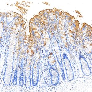 | IHC检测CA19-9蛋白(货号 GB150125). 样品: 人结肠, 4%多聚甲醛 (货号G1101) 固定12-24小时. 抗原修复: Tris-EDTA抗原修复液(pH 9.0) (G1203), 100℃, 25分钟. —抗: 1: 300稀释, 4℃ 孵育过夜. 二抗: S-vision免疫组化多聚二抗(山羊抗小鼠), 即用型(货号G1301), 室温孵育20分钟. |
