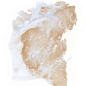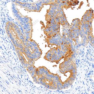 | IHC检测CA19-9蛋白(货号 GB150125). 样品: 人子宫内膜癌, 4%多聚甲醛 (货号G1101) 固定12-24小时. 抗原修复: Tris-EDTA抗原修复液(pH 9.0) (G1203), 100℃, 25分钟. —抗: 1: 300稀释, 4℃ 孵育过夜. 二抗: S-vision免疫组化多聚二抗(山羊抗小鼠), 即用型(货号G1301), 室温孵育20分钟. |