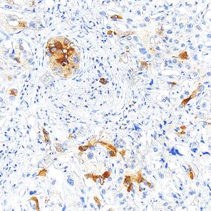 | IHC检测CA19-9蛋白(货号 GB150125). 样品: 人肝胆管癌, 4%多聚甲醛 (货号G1101) 固定12-24小时. 抗原修复: Tris-EDTA抗原修复液(pH 9.0) (G1203), 100℃, 25分钟. —抗: 1: 300稀释, 4℃ 孵育过夜. 二抗: S-vision免疫组化多聚二抗(山羊抗小鼠), 即用型(货号G1301), 室温孵育20分钟. |