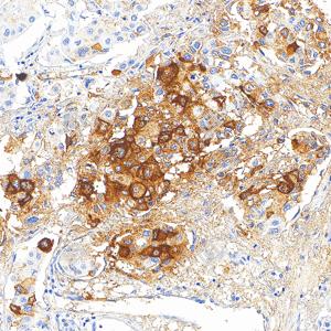 | IHC检测CA19-9蛋白(货号 GB150125). 样品: 人肺癌, 4%多聚甲醛 (货号G1101) 固定12-24小时. 抗原修复: Tris-EDTA抗原修复液(pH 9.0) (G1203), 100℃, 25分钟. —抗: 1: 300稀释, 4℃ 孵育过夜. 二抗: S-vision免疫组化多聚二抗(山羊抗小鼠), 即用型(货号G1301), 室温孵育20分钟. |