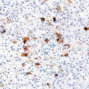 | IHC检测CA19-9蛋白(货号 GB150125). 样品: 人胃癌, 4%多聚甲醛 (货号G1101) 固定12-24小时. 抗原修复: Tris-EDTA抗原修复液(pH 9.0) (G1203), 100℃, 25分钟. —抗: 1: 500稀释, 4℃ 孵育过夜. 二抗: S-vision免疫组化多聚二抗(山羊抗小鼠), 即用型(货号G1301), 室温孵育20分钟. |