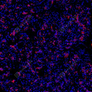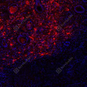 | IF检测CA19-9蛋白(货号 GB150125)(红色). 样品: 人胰腺, 4%多聚甲醛 (货号G1101) 固定12-24小时. 抗原修复: Tris-EDTA抗原修复液(pH 9.0) (G1203), 100℃, 25分钟. 封闭: 3% BSA(货号GC305010)的PBS溶液, 室温孵育30分钟. —抗: 1: 500稀释, 4℃ 孵育过夜. 二抗: Cy3标记山羊抗小鼠IgG (H+L) (货号GB21301), 1: 300稀释, 室温孵育1小时. |