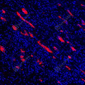 | IF检测CA19-9蛋白(货号 GB150125)(红色). 样品: 人肝癌, 4%多聚甲醛 (货号G1101) 固定12-24小时. 抗原修复: Tris-EDTA抗原修复液(pH 9.0) (G1203), 100℃, 25分钟. 封闭: 3% BSA(货号GC305010)的PBS溶液, 室温孵育30分钟. —抗: 1: 500稀释, 4℃ 孵育过夜. 二抗: Cy3标记山羊抗小鼠IgG (H+L) (货号GB21301), 1: 300稀释, 室温孵育1小时. |