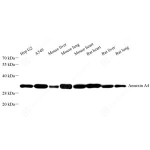 WB检测Annexin-4/ANXA4蛋白(货号 GB151147). 样品: 经RIPA裂解液(货号G2002)处理的蛋白质. 封闭: 3%脱脂牛奶(货号GC310001)溶于TBST溶液, 室温孵育1小时. —抗: 1: 500稀释, 4℃ 孵育过夜. 二抗: HRP标记山羊抗小鼠IgG (H+L) (货号GB23301), 1: 5000稀释, 室温孵育1小时. |