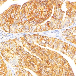IHC检测Annexin-4/ANXA4蛋白(货号 GB151147). 样品: 人子宫内膜癌, 4%多聚甲醛 (货号G1101) 固定12-24小时. 抗原修复: 柠檬酸抗原修复液(干粉, pH 6.0) (G1201), 高压锅均匀喷气计时2分钟. —抗: 1: 1300稀释, 4℃ 孵育过夜. 二抗: S-vision免疫组化多聚二抗(山羊抗小鼠), 即用型(货号G1301), 室温孵育20分钟. |