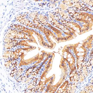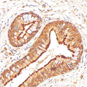 IHC检测Annexin-4/ANXA4蛋白(货号 GB151147). 样品: 大鼠结肠, 4%多聚甲醛 (货号G1101) 固定12-24小时. 抗原修复: 柠檬酸抗原修复液(干粉, pH 6.0) (G1201), 高压锅均匀喷气计时2分钟. —抗: 1: 1300稀释, 4℃ 孵育过夜. 二抗: S-vision免疫组化多聚二抗(山羊抗小鼠), 即用型(货号G1301), 室温孵育20分钟. |