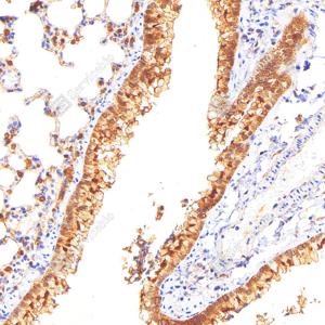 IHC检测Annexin-4/ANXA4蛋白(货号 GB151147). 样品: 小鼠肺组织24小时, 4%多聚甲醛 (货号G1101) 固定12-24小时. 抗原修复: 柠檬酸抗原修复液(干粉, pH 6.0) (G1201), 高压锅均匀喷气计时2分钟. —抗: 1: 1300稀释, 4℃ 孵育过夜. 二抗: S-vision免疫组化多聚二抗(山羊抗小鼠), 即用型(货号G1301), 室温孵育20分钟. |