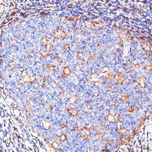 IHC检测Annexin-4/ANXA4蛋白(货号 GB151147). 样品: 人扁桃体, 4%多聚甲醛 (货号G1101) 固定12-24小时. 抗原修复: 柠檬酸抗原修复液(干粉, pH 6.0) (G1201), 高压锅均匀喷气计时2分钟. —抗: 1: 2000稀释, 4℃ 孵育过夜. 二抗: S-vision免疫组化多聚二抗(山羊抗小鼠), 即用型(货号G1301), 室温孵育20分钟. |