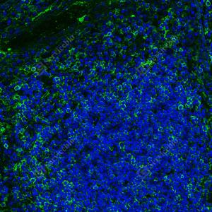 IF检测Annexin-4/ANXA4蛋白(货号 GB151147)(绿色). 样品: 人扁桃体, 4%多聚甲醛 (货号G1101) 固定12-24小时. 抗原修复: 柠檬酸抗原修复液(干粉, pH 6.0) (G1201), 高压锅均匀喷气计时2分钟. 封闭: 3% BSA(货号GC305010)的PBS溶液, 室温孵育30分钟. —抗: 1: 800稀释, 4℃ 孵育过夜. 二抗: Alexa Fluor 488标记山羊抗小鼠IgG (H+L) (货号GB25301), 1: 400稀释, 室温孵育1小时. |