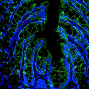 IF检测Annexin-4/ANXA4蛋白(货号 GB151147)(绿色). 样品: 大鼠结肠, 4%多聚甲醛 (货号G1101) 固定12-24小时. 抗原修复: 柠檬酸抗原修复液(干粉, pH 6.0) (G1201), 高压锅均匀喷气计时2分钟. 封闭: 3% BSA(货号GC305010)的PBS溶液, 室温孵育30分钟. —抗: 1: 800稀释, 4℃ 孵育过夜. 二抗: Alexa Fluor 488标记山羊抗小鼠IgG (H+L) (货号GB25301), 1: 400稀释, 室温孵育1小时. |