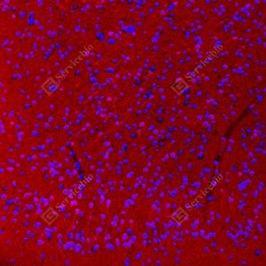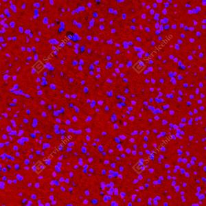 | IF检测CAMKK1蛋白(货号 GB154010)(红色). 样品: 小鼠脑, 4%多聚甲醛 (货号G1101) 固定12-24小时. 抗原修复: 抗原修复仪 (货号 ARI-4),Tris-EDTA抗原修复液(pH 9.0) (货号G1203), 水浴100℃, 25分钟. 封闭: 3% BSA(货号GC305010)的PBS溶液, 室温孵育30分钟. —抗: 1: 1000稀释, 4℃ 孵育过夜. 二抗: Cy3标记山羊抗小鼠IgG (H+L) (货号GB21301), 1: 300稀释, 室温孵育1小时. |