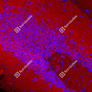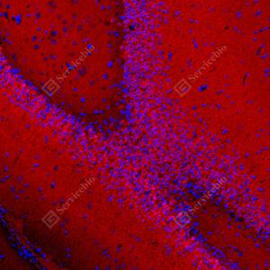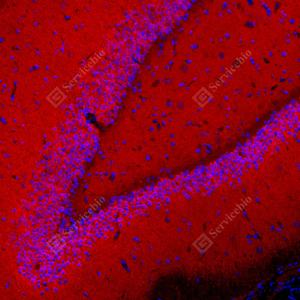 | IF检测CAMKK1蛋白(货号 GB154010)(红色). 样品: 大鼠海马区, 4%多聚甲醛 (货号G1101) 固定12-24小时. 抗原修复: 抗原修复仪 (货号 ARI-4),Tris-EDTA抗原修复液(pH 9.0) (货号G1203), 水浴100℃, 25分钟. 封闭: 3% BSA(货号GC305010)的PBS溶液, 室温孵育30分钟. —抗: 1: 1000稀释, 4℃ 孵育过夜. 二抗: Cy3标记山羊抗小鼠IgG (H+L) (货号GB21301), 1: 300稀释, 室温孵育1小时. |