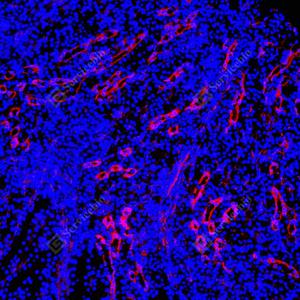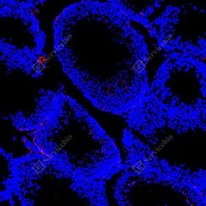 | IF检测CAMKK1蛋白(货号 GB1504010)(红色). 样品: 大鼠睾丸, 4%多聚甲醛 (货号G1101) 固定12-24小时. 抗原修复: 抗原修复仪 (货号 ARI-4),Tris-EDTA抗原修复液(pH 9.0) (货号G1203), 水浴100℃, 25分钟. 封闭: 3% BSA(货号GC305010)的PBS溶液, 室温孵育30分钟. —抗: 1: 1000稀释, 4℃ 孵育过夜. 二抗: Cy3标记山羊抗小鼠IgG (H+L) (货号GB21301), 1: 300稀释, 室温孵育1小时. |