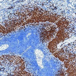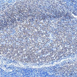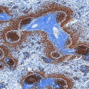 | IHC检测PAX5蛋白(货号 GB155495). 样品: 大鼠脾, 4%多聚甲醛 (货号G1101) 固定12-24小时. 抗原修复: Tris-EDTA抗原修复液(pH 9.0) (G1203), 100℃, 25分钟. —抗: 1: 2000稀释, 4℃ 孵育过夜. 二抗: S-vision免疫组化多聚二抗(山羊抗兔),即用型 (货号G1302), 室温孵育20分钟. |