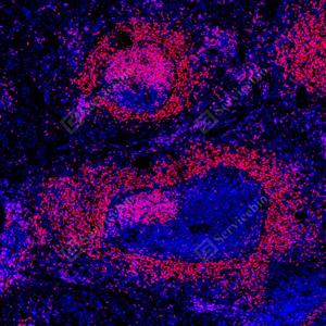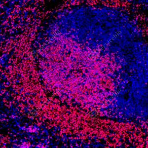 | IF检测PAX5蛋白(货号 GB155495)(红色). 样品: 人扁桃体, 4%多聚甲醛 (货号G1101) 固定12-24小时. 抗原修复: Tris-EDTA抗原修复液(pH 9.0) (G1203), 100℃, 25分钟. 封闭: 3% BSA(货号GC305010)的PBS溶液, 室温孵育30分钟. —抗: 1: 2000稀释, 4℃ 孵育过夜. 二抗: Cy3标记山羊抗兔IgG (H+L) (货号GB21303), 1: 300稀释, 室温孵育1小时. |
