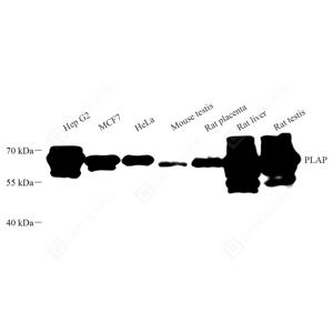 WB检测Placental alkaline phosphatase (PLAP)蛋白(货号 GB122545). 样品: 经RIPA裂解液(货号G2002)处理的蛋白质. 封闭: 封闭: 3%脱脂牛奶(货号GC310001)溶于TBST溶液, 室温孵育1小时. —抗: 1: 1000稀释, 4℃ 孵育过夜. 二抗: HRP标记山羊抗小鼠IgG (H+L) (货号GB23301), 1: 5000稀释, 室温孵育1小时. |