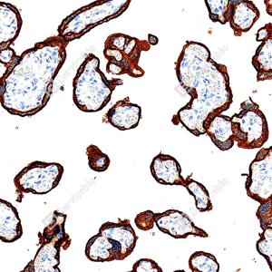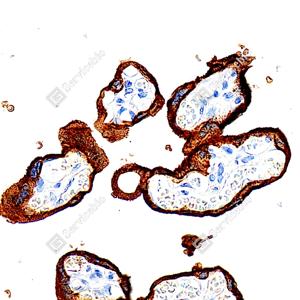 | IHC检测Placental alkaline phosphatase (PLAP)蛋白(货号 GB152546). 样品: 人胎盘, 4%多聚甲醛 (货号G1101) 固定12-24小时. 抗原修复: Tris-EDTA抗原修复液(pH 9.0) (G1203), 100℃, 25分钟. —抗: 1: 1000稀释, 4℃ 孵育过夜. 二抗: S-vision免疫组化多聚二抗(山羊抗兔),即用型 (货号G1302), 室温孵育20分钟. |