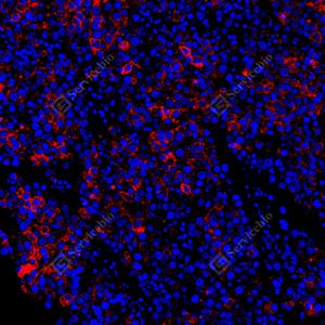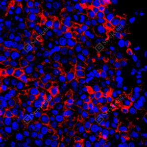 | IF检测Placental alkaline phosphatase (PLAP)蛋白(货号 GB152546)(红色). 样品: 人精原细胞瘤, 4%多聚甲醛 (货号G1101) 固定12-24小时. 抗原修复: Tris-EDTA抗原修复液(pH 9.0) (G1203), 100℃, 25分钟. 封闭: 3% BSA(货号GC305010)的PBS溶液, 室温孵育30分钟. —抗: 1: 1000稀释, 4℃ 孵育过夜. 二抗: Cy3标记山羊抗兔IgG (H+L) (货号GB21303), 1: 300稀释, 室温孵育1小时. |