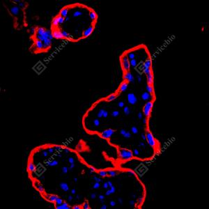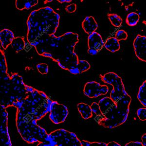 | IF检测Placental alkaline phosphatase (PLAP)蛋白(货号 GB152546)(红色). 样品: 人胎盘, 4%多聚甲醛 (货号G1101) 固定12-24小时. 抗原修复: Tris-EDTA抗原修复液(pH 9.0) (G1203), 100℃, 25分钟. 封闭: 3% BSA(货号GC305010)的PBS溶液, 室温孵育30分钟. —抗: 1: 1000稀释, 4℃ 孵育过夜. 二抗: Cy3标记山羊抗兔IgG (H+L) (货号GB21303), 1: 300稀释, 室温孵育1小时. |