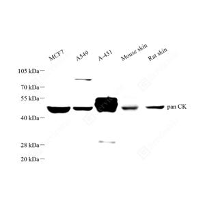 WB检测Acidic Cytokeratin蛋白(货号 GB152050). 样品: 经RIPA裂解液(货号G2002)处理的蛋白质. 封闭: 3%脱脂牛奶(货号GC310001)溶于TBST溶液, 室温孵育1小时. —抗: 1: 1000稀释, 4℃ 孵育过夜. 二抗: HRP标记山羊抗小鼠IgG (H+L) (货号GB23301), 1: 5000稀释, 室温孵育1小时. |