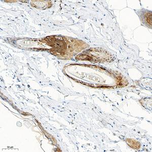 IHC检测Cystatin-B蛋白(货号 GB115588). 样品: 大鼠皮肤, 4%多聚甲醛 (货号G1101) 固定12-24小时. 抗原修复: Tris-EDTA抗原修复液(pH 9.0) (G1203), 98℃, 20分钟. —抗: 1: 150稀释, 4℃ 孵育过夜. 二抗: HRP标记山羊抗兔IgG (H+L) (货号GB23303), 1: 200稀释, 室温孵育1小时. |