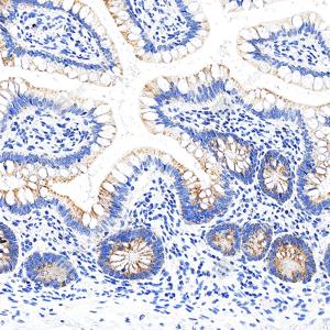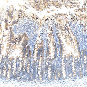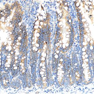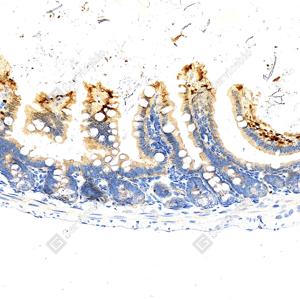 | IHC检测GSDME蛋白(货号 GB150167). 样品: 小鼠小肠, 4%多聚甲醛 (货号G1101) 固定12-24小时. 抗原修复: 抗原修复仪(货号 ARI-4), Tris-EDTA抗原修复液(pH 9.0) (货号G1203), 水浴100℃, 25分钟. —抗: 1: 3000稀释, 4℃ 孵育过夜. 二抗: S-vision免疫组化多聚二抗(山羊抗兔),即用型 (货号G1302), 室温孵育20分钟. |