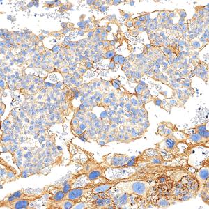 | IHC检测GSDME蛋白(货号 GB150167). 样品: CT26细胞裸鼠皮下移植模型, 4%多聚甲醛 (货号G1101) 固定12-24小时. 抗原修复: 抗原修复仪(货号 ARI-4), Tris-EDTA抗原修复液(pH 9.0) (货号G1203), 水浴100℃, 25分钟. —抗: 1: 1500稀释, 4℃ 孵育过夜. 二抗: S-vision免疫组化多聚二抗(山羊抗兔),即用型 (货号G1302), 室温孵育20分钟. |