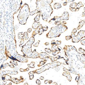 | IHC检测GSDME蛋白(货号 GB150167). 样品: 小鼠胎盘, 4%多聚甲醛 (货号G1101) 固定12-24小时. 抗原修复: 抗原修复仪(货号 ARI-4), Tris-EDTA抗原修复液(pH 9.0) (货号G1203), 水浴100℃, 25分钟. —抗: 1: 1500稀释, 4℃ 孵育过夜. 二抗: S-vision免疫组化多聚二抗(山羊抗兔),即用型 (货号G1302), 室温孵育20分钟. |