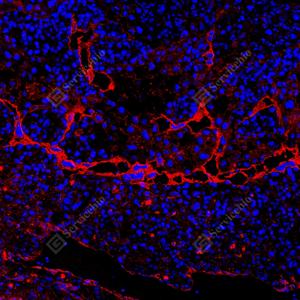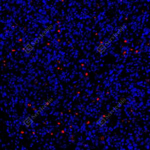 | IF检测GSDME蛋白(货号 GB150167)(红色). 样品: CT26细胞裸鼠皮下移植模型, 4%多聚甲醛 (货号G1101) 固定12-24小时. 抗原修复: 抗原修复仪(货号 ARI-4), Tris-EDTA抗原修复液(pH 9.0) (货号G1203), 水浴100℃, 25分钟. 封闭: 3% BSA(货号GC305010)的PBS溶液, 室温孵育30分钟. —抗: 1: 1000稀释, 4℃ 孵育过夜. 二抗: Cy3标记山羊抗兔IgG (H+L) (货号GB21303), 1: 300稀释, 室温孵育1小时. |