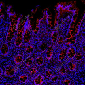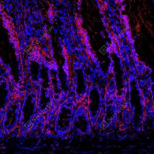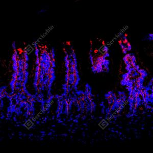 | IF检测GSDME蛋白(货号 GB150167)(红色). 样品: 小鼠小肠, 4%多聚甲醛 (货号G1101) 固定12-24小时. 抗原修复: 抗原修复仪(货号 ARI-4), Tris-EDTA抗原修复液(pH 9.0) (货号G1203), 水浴100℃, 25分钟. 封闭: 3% BSA(货号GC305010)的PBS溶液, 室温孵育30分钟. —抗: 1: 1000稀释, 4℃ 孵育过夜. 二抗: Cy3标记山羊抗兔IgG (H+L) (货号GB21303), 1: 300稀释, 室温孵育1小时. |