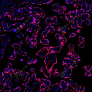 | IF检测GSDME蛋白(货号 GB150167)(红色). 样品: 人胎盘, 4%多聚甲醛 (货号G1101) 固定12-24小时. 抗原修复: 抗原修复仪(货号 ARI-4), Tris-EDTA抗原修复液(pH 9.0) (货号G1203), 水浴100℃, 25分钟. 封闭: 3% BSA(货号GC305010)的PBS溶液, 室温孵育30分钟. —抗: 1: 1000稀释, 4℃ 孵育过夜. 二抗: Cy3标记山羊抗兔IgG (H+L) (货号GB21303), 1: 300稀释, 室温孵育1小时. |